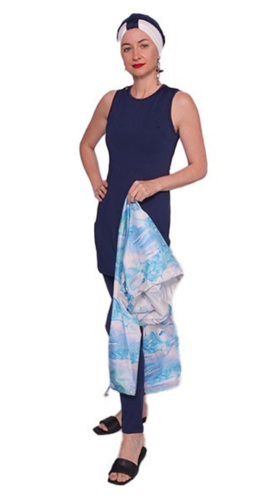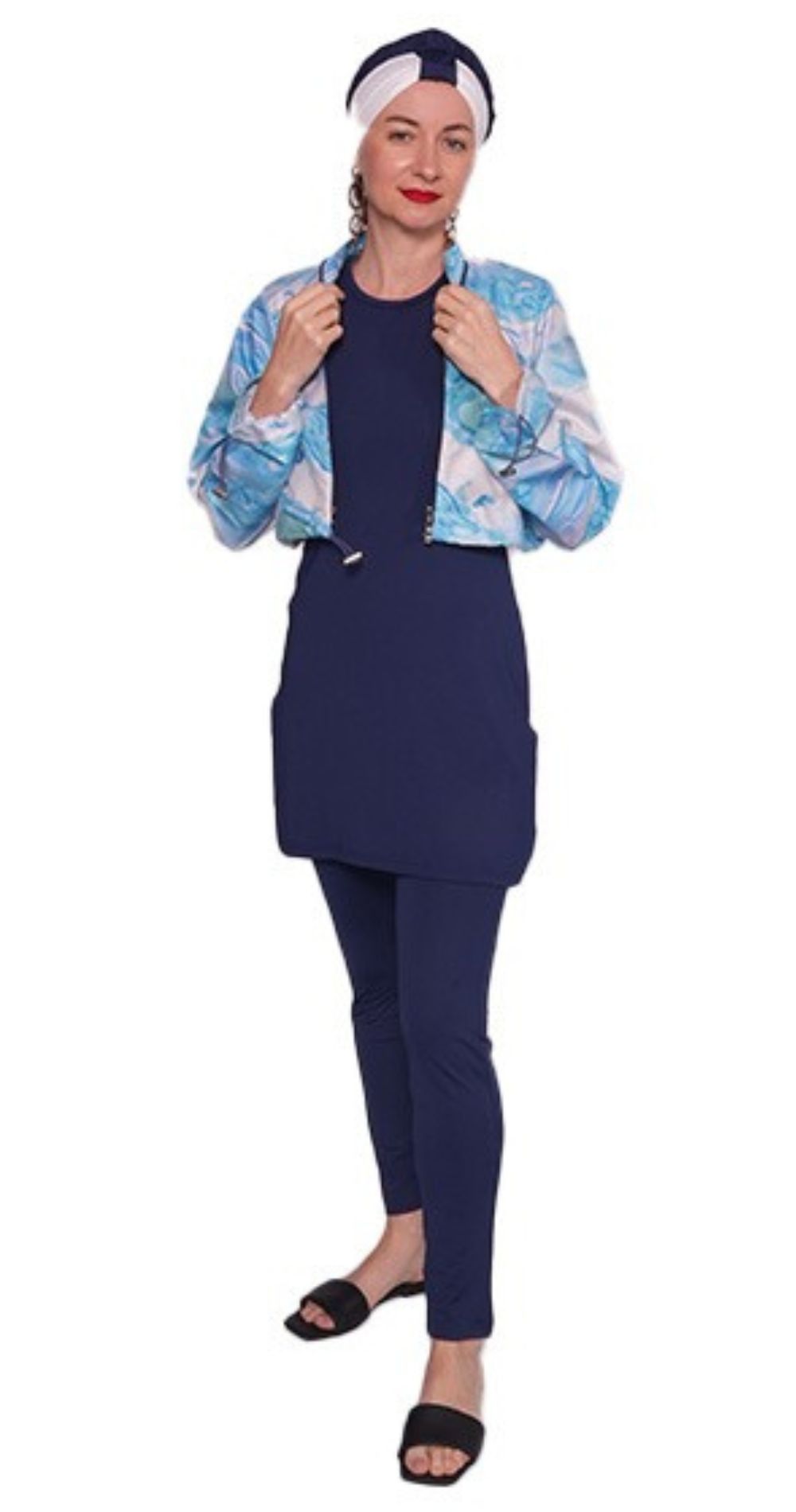 Step into the water with confidence and grace in the Blue Ocean Breeze Modest Burkini, designed for modern women who value both style and modesty. This elegant swim set features a beautiful ocean-inspired print top paired with a navy tunic and leggings, creating a look that’s effortlessly chic and flattering for all body types.