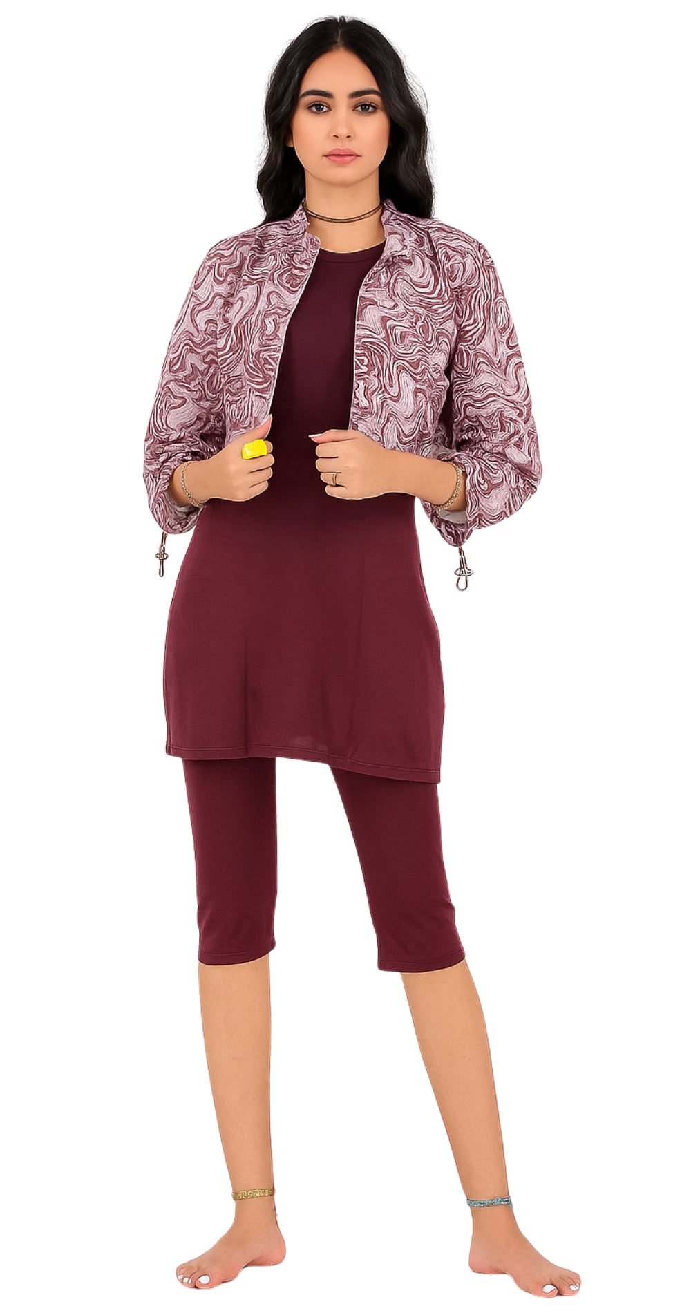 Experience refined modesty with the Plum Modest Burkini with Printed Bolero, designed for women who appreciate timeless style and graceful coverage. This elegant set features a rich plum base paired with a lightweight printed bolero jacket, adding a touch of sophistication and flair to your beachwear look.