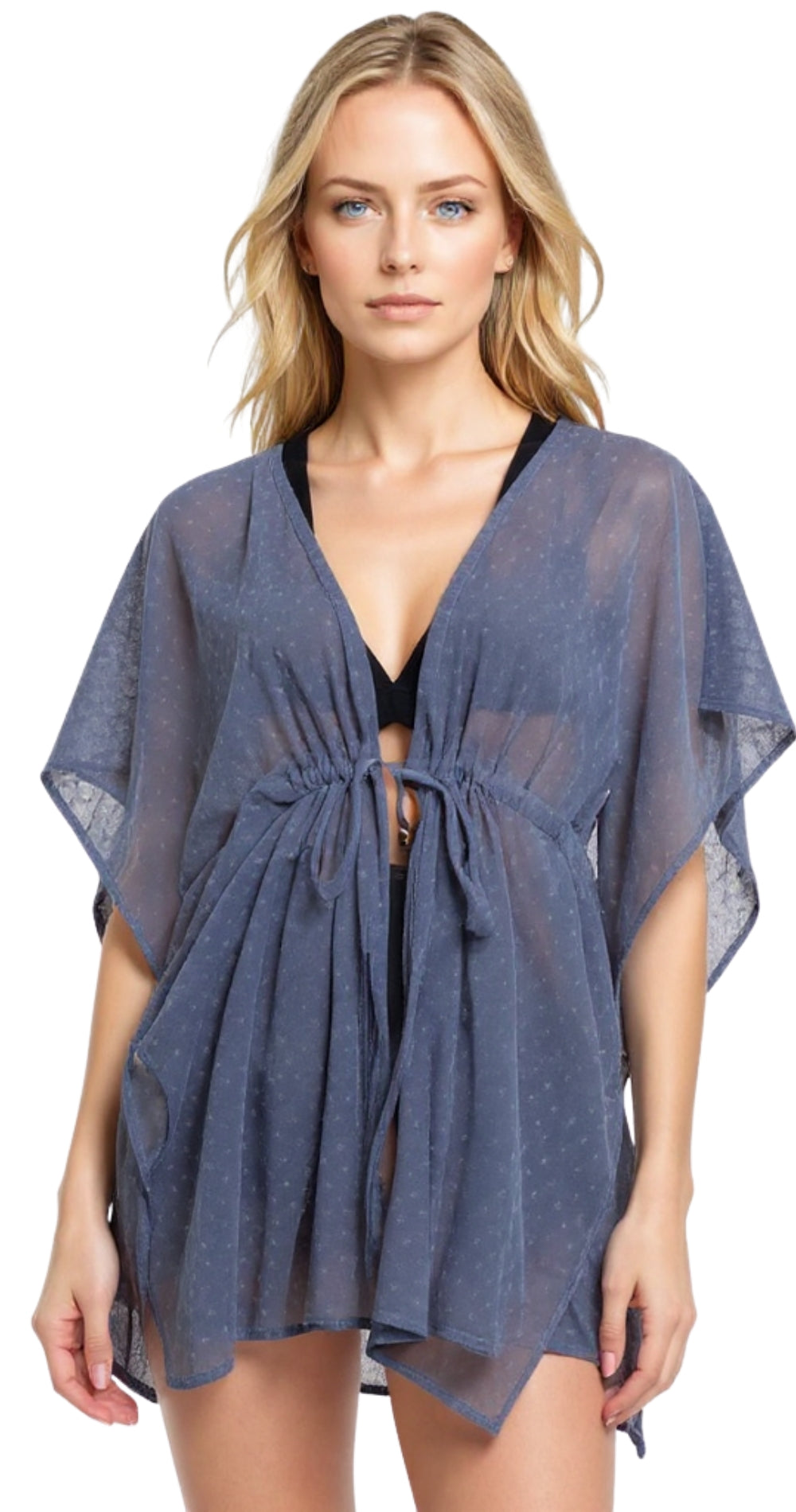 Stay stylish and comfortable by the water with this dusty blue sheer beach cover-up, designed for effortless elegance and practical layering over your swimwear. Made from lightweight, breathable fabric, it features a deep V-neckline, adjustable drawstring waist, and relaxed sleeves, creating a flattering and flowy silhouette for any body type.