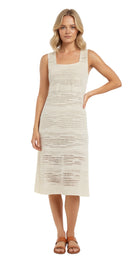 Step into effortless style with this white sleeveless textured midi dress, designed with a square neckline and relaxed A-line silhouette. The lightweight woven fabric adds a subtle texture, making it the perfect resort wear staple for warm, sunny days.