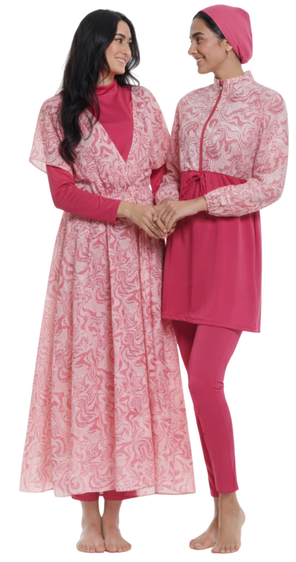 Оставайтесь стильными и чувствуйте себя комфортно на пляже или у бассейна с нашим розовым комплектом буркини 5-в-1 , созданным для женщин, которые ценят скромность, не жертвуя при этом модой. Этот универсальный комплект включает в себя тунику, леггинсы, шапочку для плавания и стильную куртку с принтом – предоставляя вам множество вариантов для создания разных образов.
